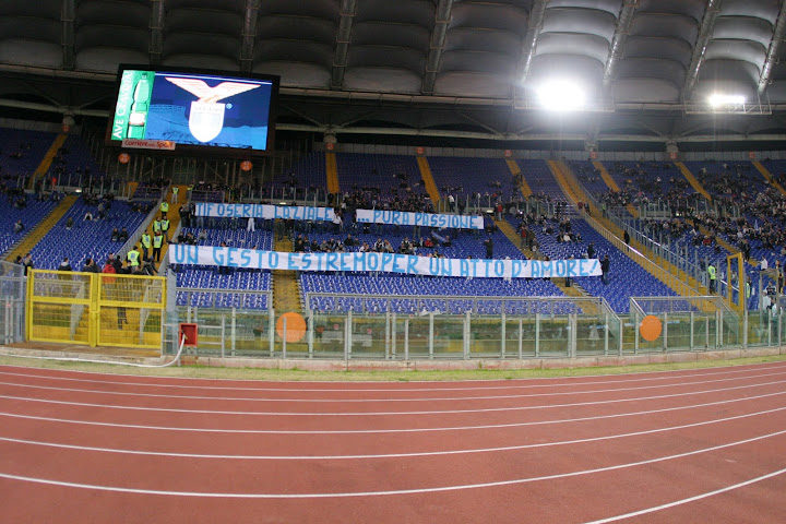 Curva Nord quasi completamente vuota (con uno striscione "Tifoseria Laziale...Pura passione. Un gesto estremo per un atto d'amore!"), Curva Maestrelli, come al solito, con circa un centinaio di presenti (ed uno striscione con scritto "Qui solo per la squadra", tribune con ampi spazi liberi. Da segnalare, affissi al botteghino riservato alla stampa due cartelli adibiti alla consegna dei tagliandi per le forze armate. I presenti nell'impianto romano sono circa 9000.