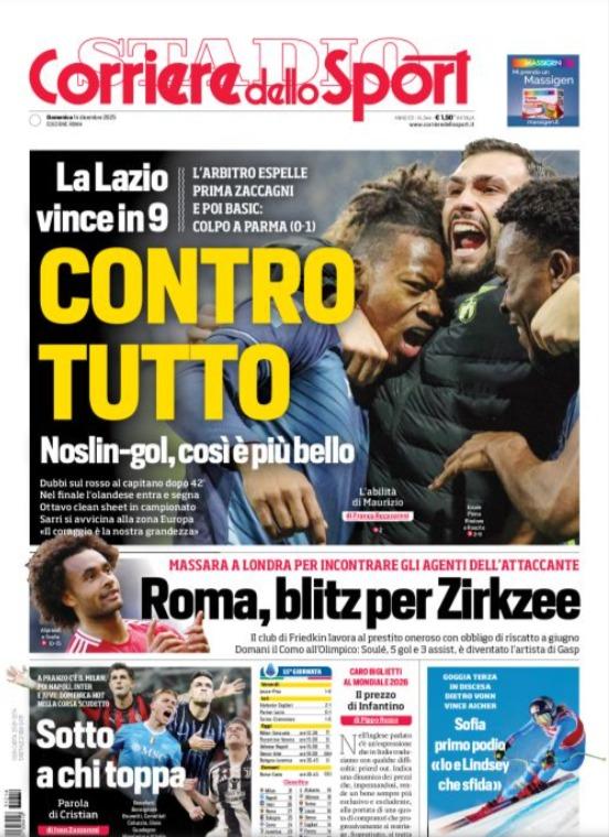 "CONTRO TUTTO" - La Lazio vince "contro tutto" come titola la prima pagina del Corriere dello Sport, celebrando il successo di Parma, celebrando la disumana resilienza di una squadra che replica il successo di Plzen di un anno fa, si ripete e fa urlare di gioia un popolo che l'ha sostenuta fino all'ultimo istante, che per 90' ha cantato per lei senza lasciarsi intimorire dalla doppia inferiorità numerica e che, anzi, è proprio in quel momento, con l'espulsione di Basic, che ha iniziato a crederci più di prima. "La Lazio vince in 9" scrive il Corriere dello Sport, che poi aggiunge: "Noslin-gol, così è più bello". E neanche potete immaginare quanto...