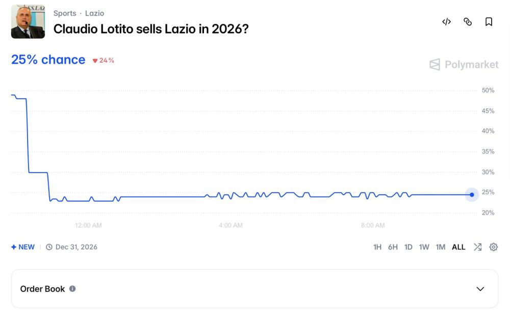 LA PREDICTION - "Lotito venderà la Lazio nel 2026?" è la domanda che viene proposta ai vari utenti registrati su Polymarket che, di conseguenza, avranno la possibilità di scommettere sui vari esiti. Sono due, in particolar modo, le strade su cui poter puntare: una è quella del 'Sì', qualora dovesse essere ritenuta possibile una cessione della Lazio entro la fine dell'anno; l'altra è quella del 'No' se si pensa che il 1° gennaio 2027 Lotito sarà ancora il presidente della società biancoceleste.