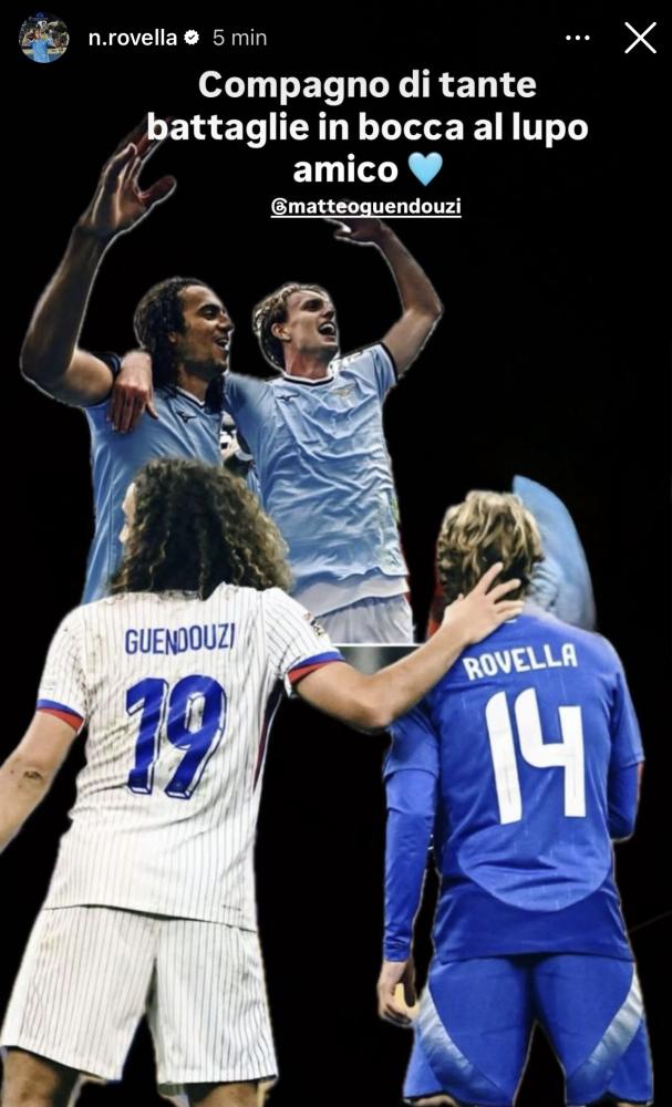 Il numero 6 biancoceleste ha postato una storia di loro due abbracciati su un'esultanza e poi di loro due rivali nel match tra Francia e Italia dello scorso anno. Il messaggio che accompagna la foto recita: "Compagno di tante battaglie, in bocca al lupo amico".