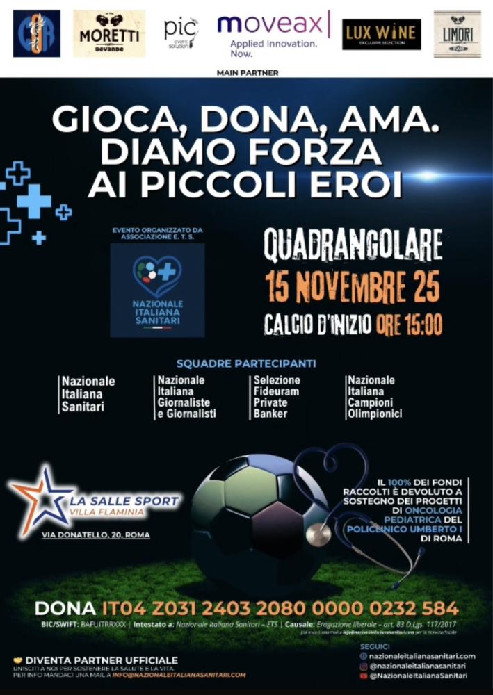 Il 15 novembre al circolo di Villa Flaminia, via Donatello, Roma, alle ore 15, si terrà un torneo quadrangolare di beneficenza! Luca Cipriano, presidente e capitano della Nazionale Italiana Sanitari ( si può seguire sui social sito o Instagram “nazionaleitalianasanitari” ) invita a contribuire e a effettuare una donazione, che servirà per il reparto oncologico di pediatria del policlinico Umberto 1! Inserire nella causale nome, cognome, codice fiscale e e-mail sarà fondamentale. Si ricorda che l’entrata sarà gratuita, saranno presenti numerose personalità del mondo politico, sportivo e dello spettacolo!