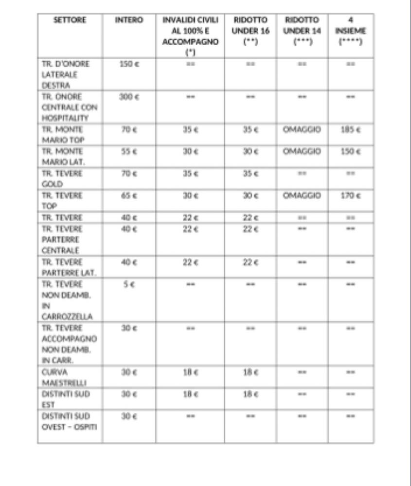(*) I biglietti ridotti Invalidi Civili al 100% e la Tribuna Tevere non deambulanti entrambi con accompagnatore, posso essere acquistati solo presso i negozi Lazio Style 1900.