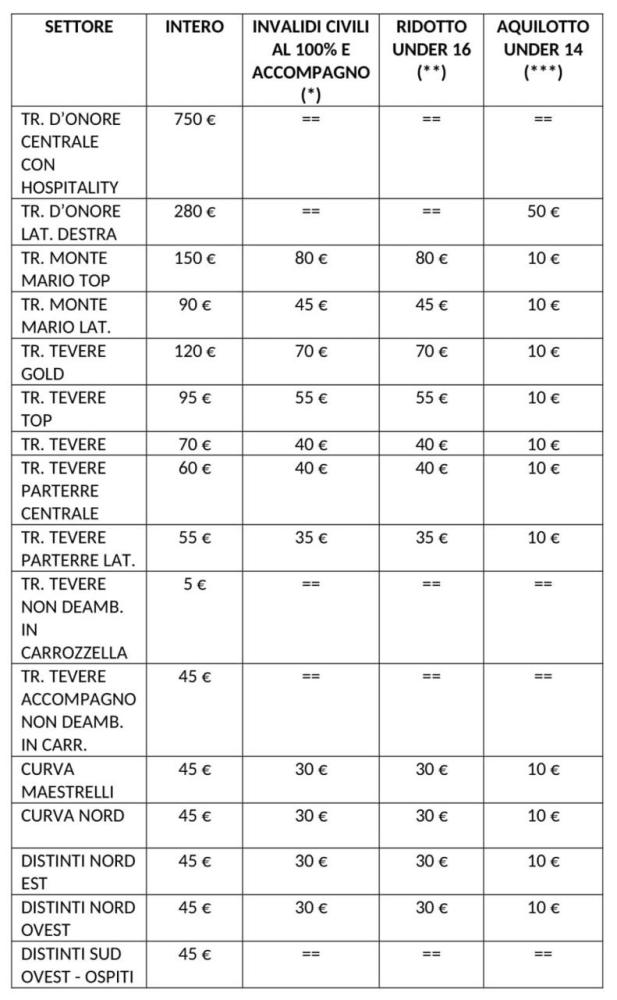 (*) I biglietti ridotti Invalidi Civili al 100% e la Tribuna Tevere non deambulanti entrambi con accompagnatore, posso essere acquistati solo presso i negozi Lazio Style 1900.