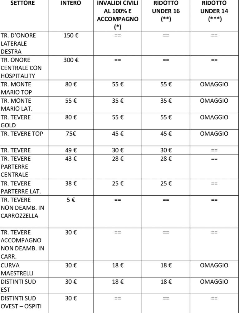 (*) I biglietti ridotti Invalidi Civili al 100% e la Tribuna Tevere non deambulanti entrambi con accompagnatore, posso essere acquistati solo presso i Lazio Style 1900.