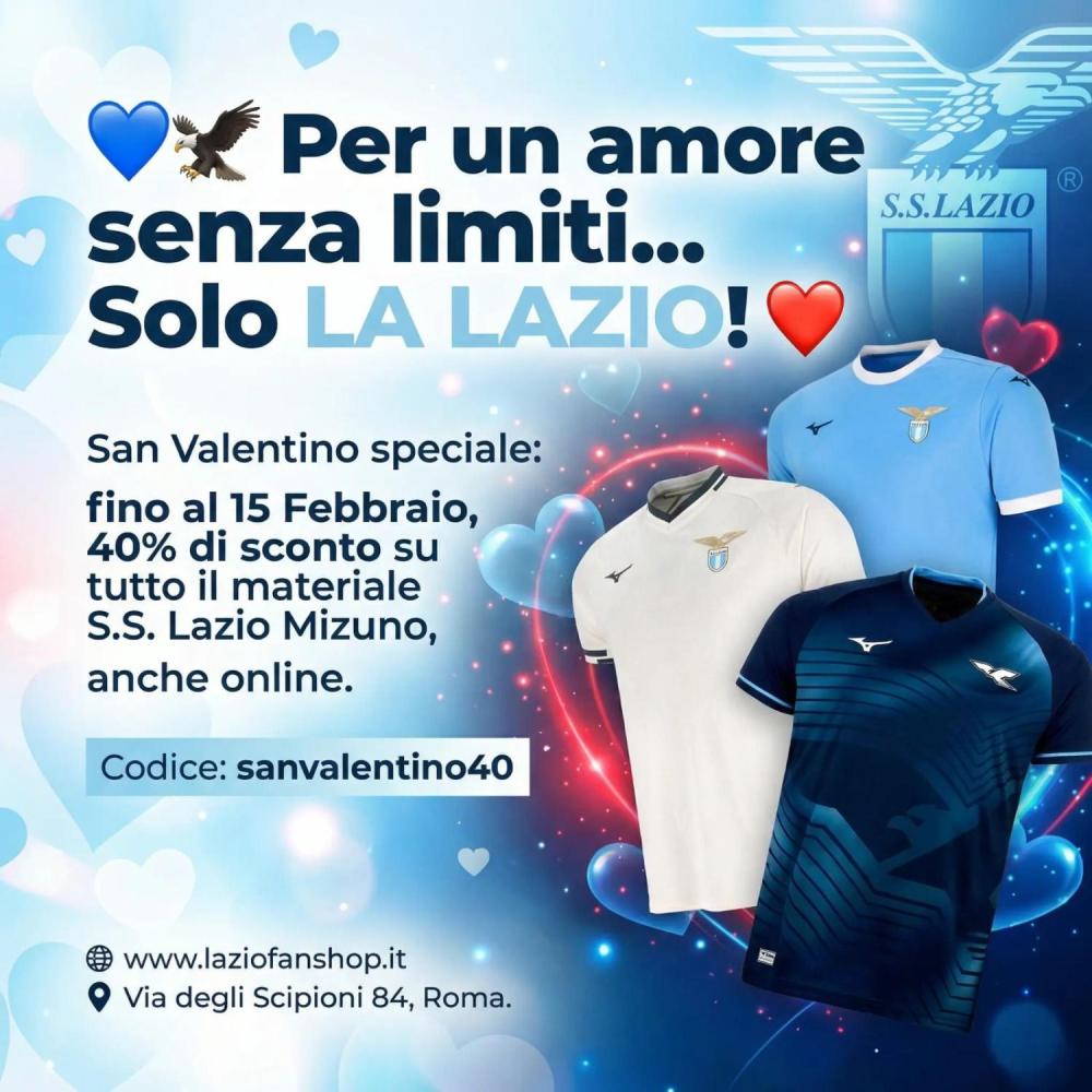 In occasione di San Valentino, fino al 15 Febbraio approfitta del 40% di sconto su tutto il materiale S.S. Lazio Mizuno, disponibile anche online.