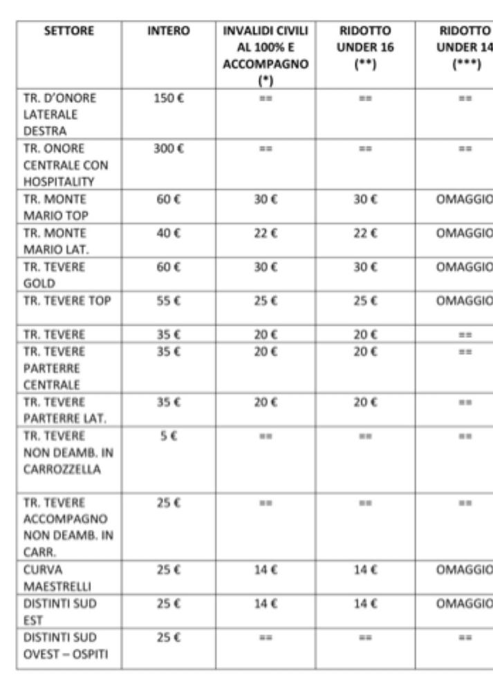 (*) I biglietti ridotti Invalidi Civili al 100% e la Tribuna Tevere non deambulanti entrambi con accompagnatore, posso essere acquistati solo presso i Lazio Style 1900.