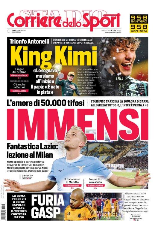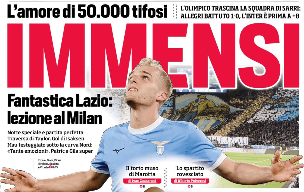 Una serata da laziali, con la squadra che è stata spinta dai suoi tifosi a dare il meglio di sé. "Immensi", il Corriere dello Sport ha esaltato così in prima pagina la vittoria biancoceleste. Un elogio alla prestazione e alla magia dei 50.000 dell'Olimpico.