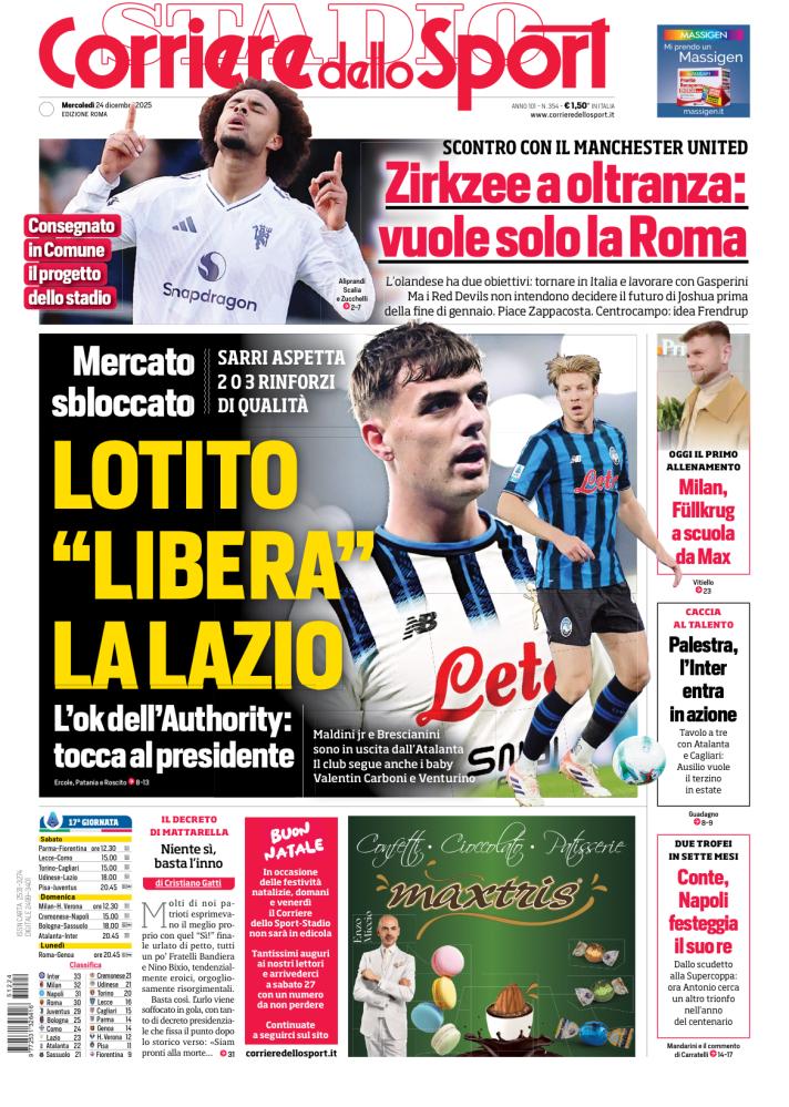 RASSEGNA STAMPA - Mercato sbloccato totalmente. Lotito ce l'ha fatta, la Lazio non avrà vincoli nel prossimo mercato di gennaio. Lo certifica anche l'edizione odierna de Il Corriere dello Sport, che nell'edizione romana ha aperto in prima pagina con il titolo "Lotito 'libera' la Lazio".