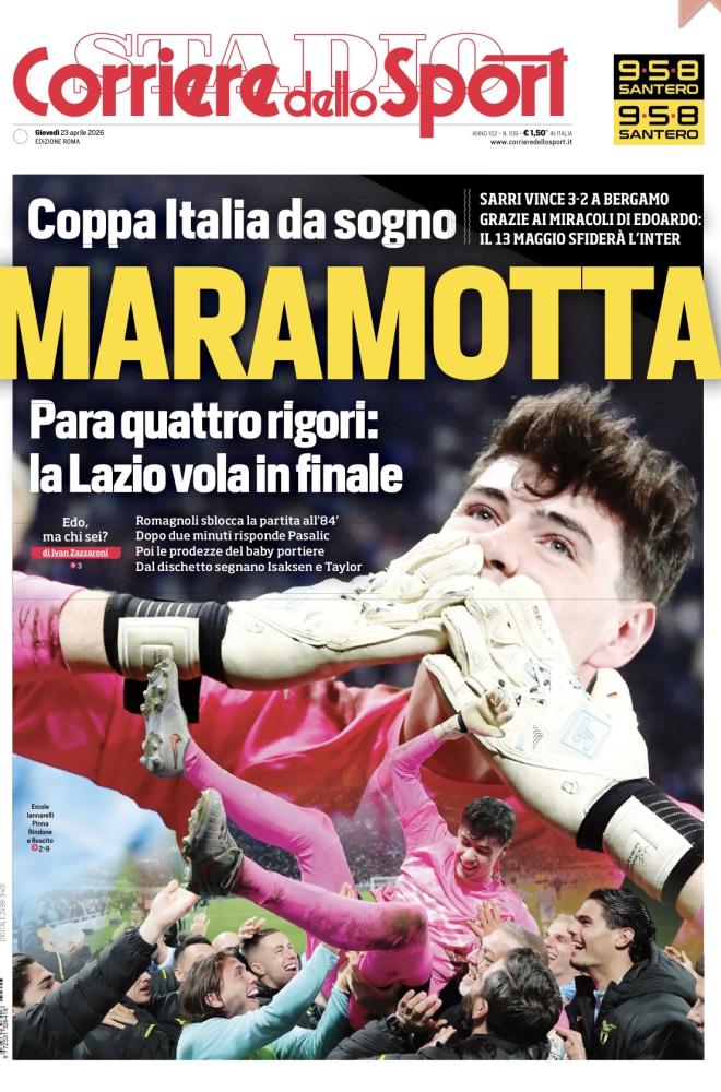 È proprio per lui la prima pagina dell'edizione odierna del Corriere dello Sport. "Maramotta" titola il quotidiano, che in copertina ha esaltato il baby portiere con due foto diverse: in una è catturata tutta la sua emozione, mentre nell'altra viene portato in trionfo dai compagni.